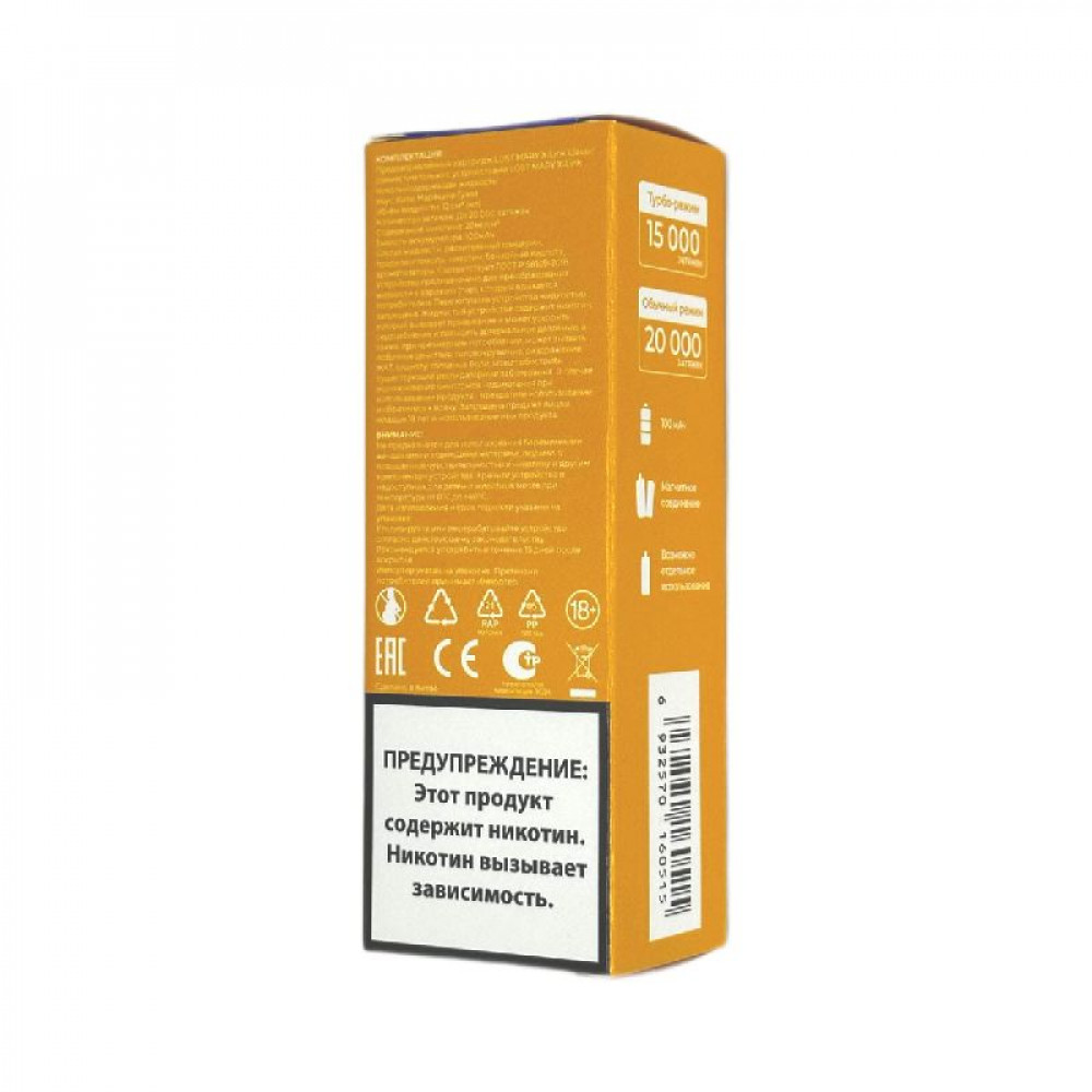 Емкость аккумулятора, мА/ч1100 ЗарядкаType-C (картридж можно использовать отдельно от устройства но заряжать с блоком) Количество затяжек, шт20000
