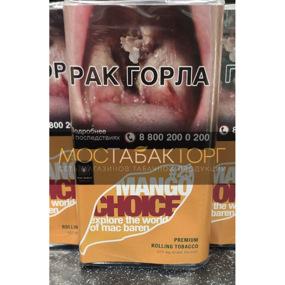 Mac Baren Mango Choice (Мак Барен Манго Чойз) табак сигаретный с насыщенным и сладковатым ароматом. Табачная смесь состоит из Вирджинии и Берлей. Тонкая нарезка табака способствует легкому «забитию» сигарет и мягкому курению. Табак средней крепости.